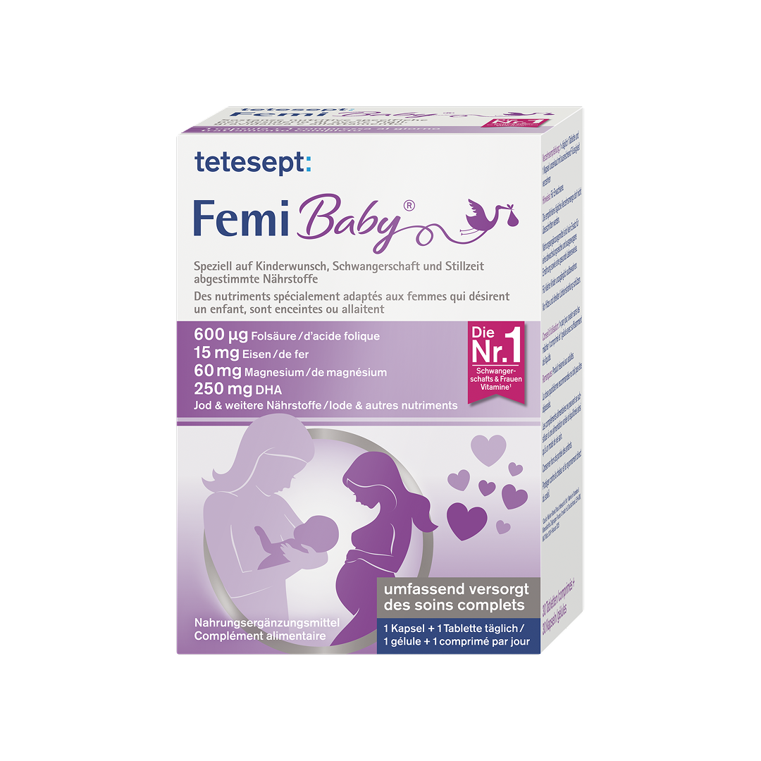 tetesept Femi Baby® enthält speziell auf Kinderwunsch, Schwangerschaft und Stillzeit abgestimmte Nährstoffe. tetesept Femi Baby® enthält Folsäure, Eisen, Magnesium, DHA und Jod sowie 11 weitere Vitamine und Mineralstoffe für eine umfassende Versorgung von Frauen mit Kinderwunsch, Schwangeren und Stillenden. Die Konzentration der Inhaltsstoffe berücksichtigt die Empfehlungen der deutschen Gesellschaft für Ernährung. tetesept Femi Baby® trägt so dank Folsäure zum Wachstum des mütterlichen Gewebes und dank des enthaltenden Eisens zur normalen Bildung roter Blutkörperchen und zu normalem Sauerstofftransport bei. Des Weiteren unterstützt das Jod in tetesept Femi Baby® eine gesunde Produktion von Schilddrüsenhormonen, während das angereicherte DHA zur normalen Entwicklung des Gehirns und der Augen des Fötus beiträgt. Hierfür sollten von der Mutter neben der empfohlenen Tagesdosis von Omega-3-Fettsäuren (d.h. 250mg DHA + EPA) täglich 200mg DHA zugeführt werden.